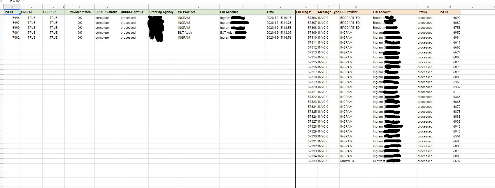 If you set these two reports to run as recurring every day after midnight, you can then create a spreadsheet to pair them to find if there are any errors in your purchase orders or invoices, and if you received a corresponding ORDRSP for each of your purchase orders. The spreadsheet also checks that the ORDERS message and ORDRSP message came through on the same EDI account, so it's checking that there's not a mismatch between those. For invoices, you can check to make sure that there wasn't a proc_error on any of the invoices that came in the day before.