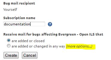 - Submit documentation needs at https://bugs.launchpad.net/evergreen/+filebug.