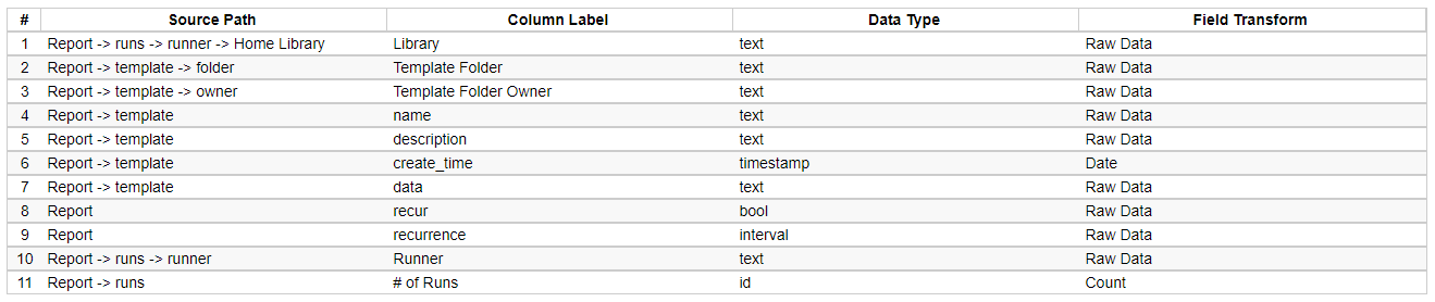 This template shows all templates used during a specific date range, with template folder and owner. It indicates if the reports run are recurring and the number of times they were run within the date range.