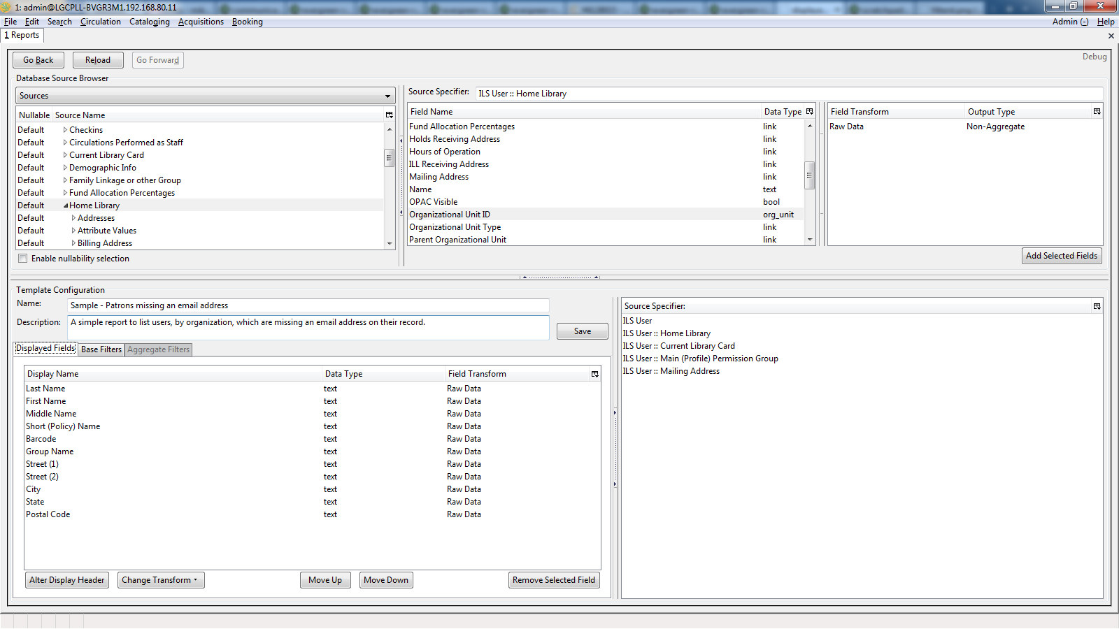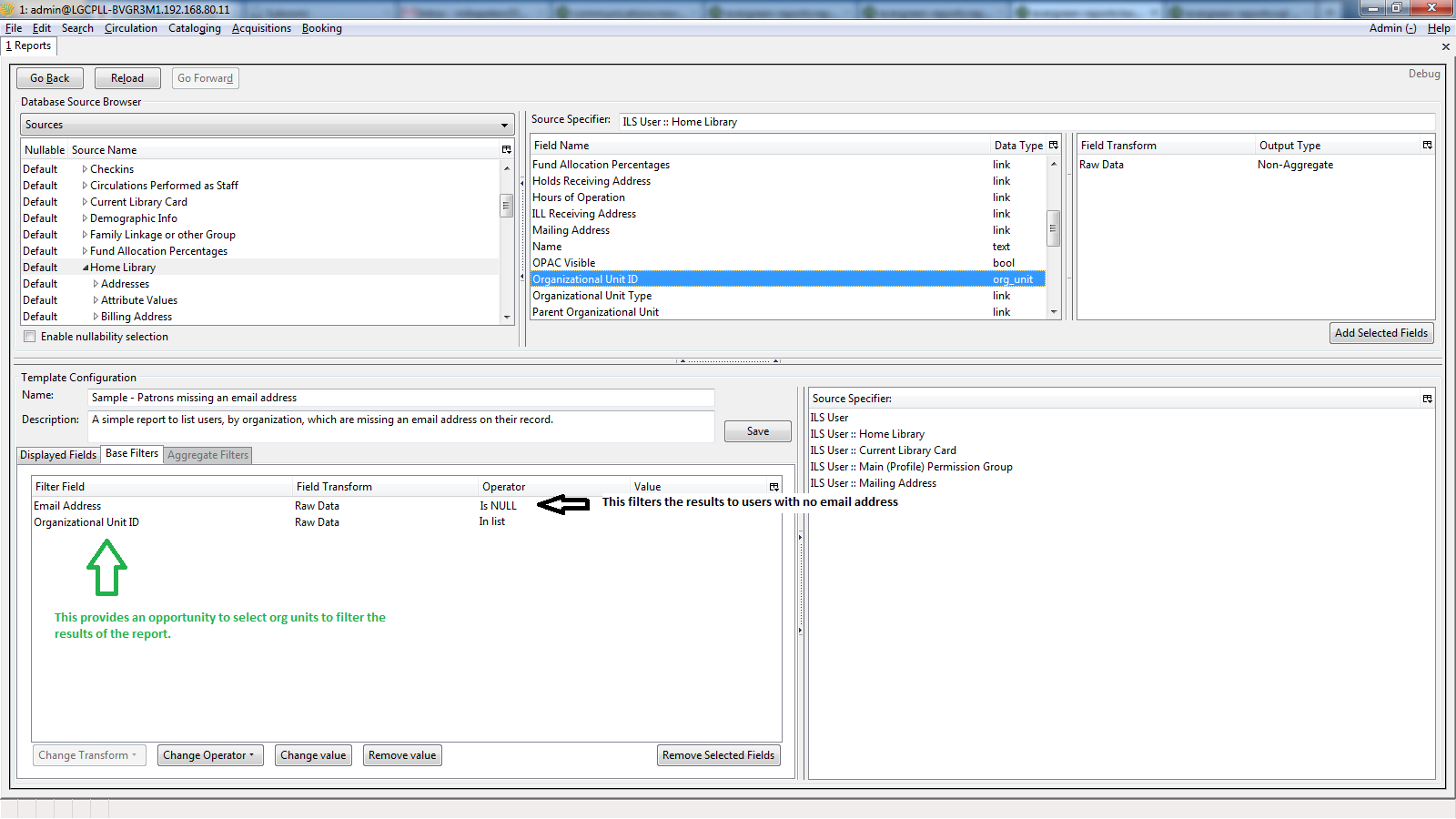 ILS User :: Email Address (Set Operator to "Is NULL") ILS User :: Home Library :: Organizational Unit ID