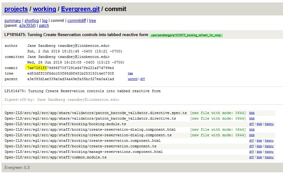 Identify the unique commit identifier for the patch you wish to test. This is found by clicking on a link in the related launchpad bug, or navigating to https://git.evergreen-ils.org > working/Evergreen.git > clicking on the link under "heads", then clicking on the branch. Once there, copy the first 7+ characters from the unique commit code.